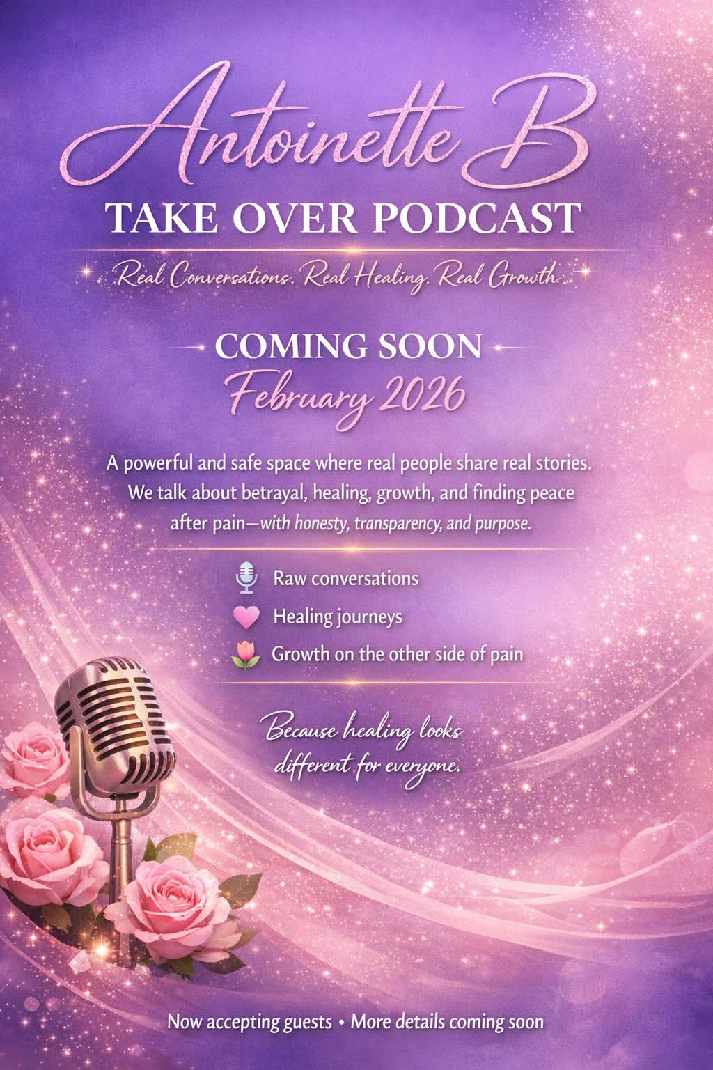 My name is Antoinette B, and I am the creator and host of the Antoinette B Take Over Podcast, a purpose-driven platform centered on truth, healing, and personal transformation. My brand was created from lived experiences—navigating betrayal, loss, growth, and the journey of learning how to heal out loud rather than suffer in silence.