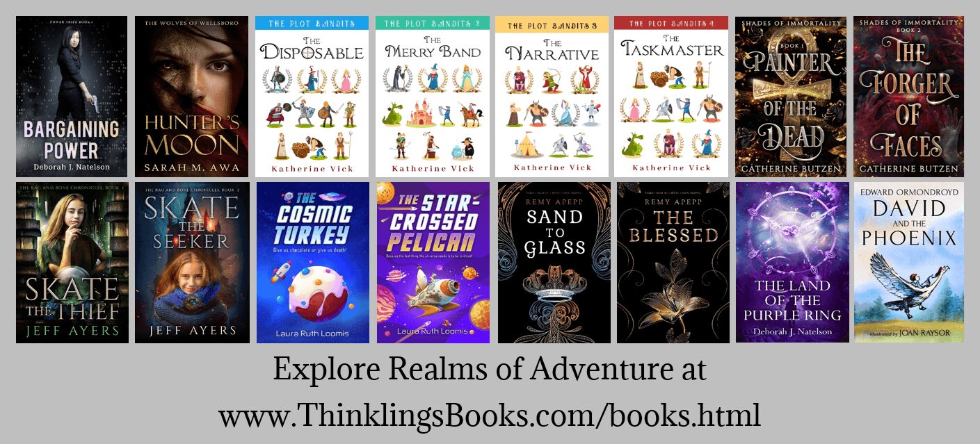 Thinklings Books publishes unputdownable fantasy and sci-fi books. It started out when three speculative-fiction-loving professional editors—Deborah Natelson, Jeannie Ingraham, and I—got together and formed a writing group. We called ourselves the Thinklings, in honor of C.S. Lewis and J.R.R. Tolkien’s group, the Inklings.