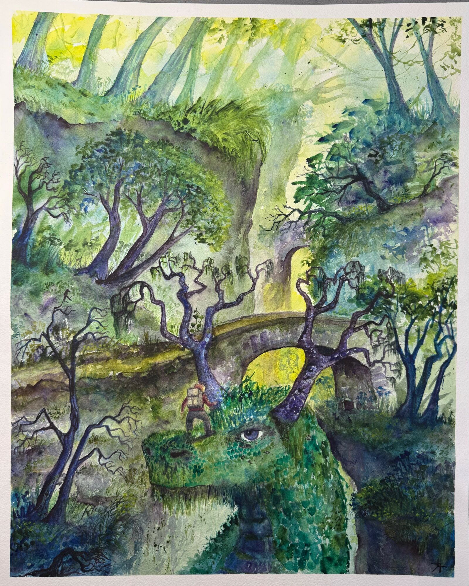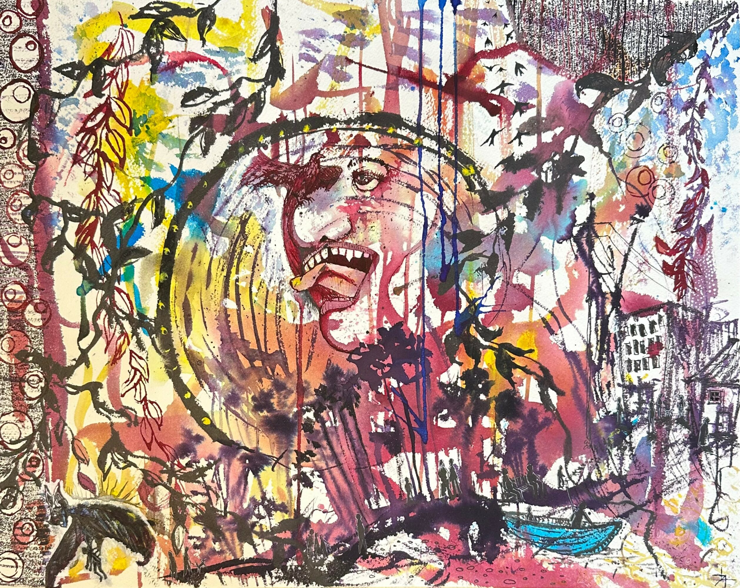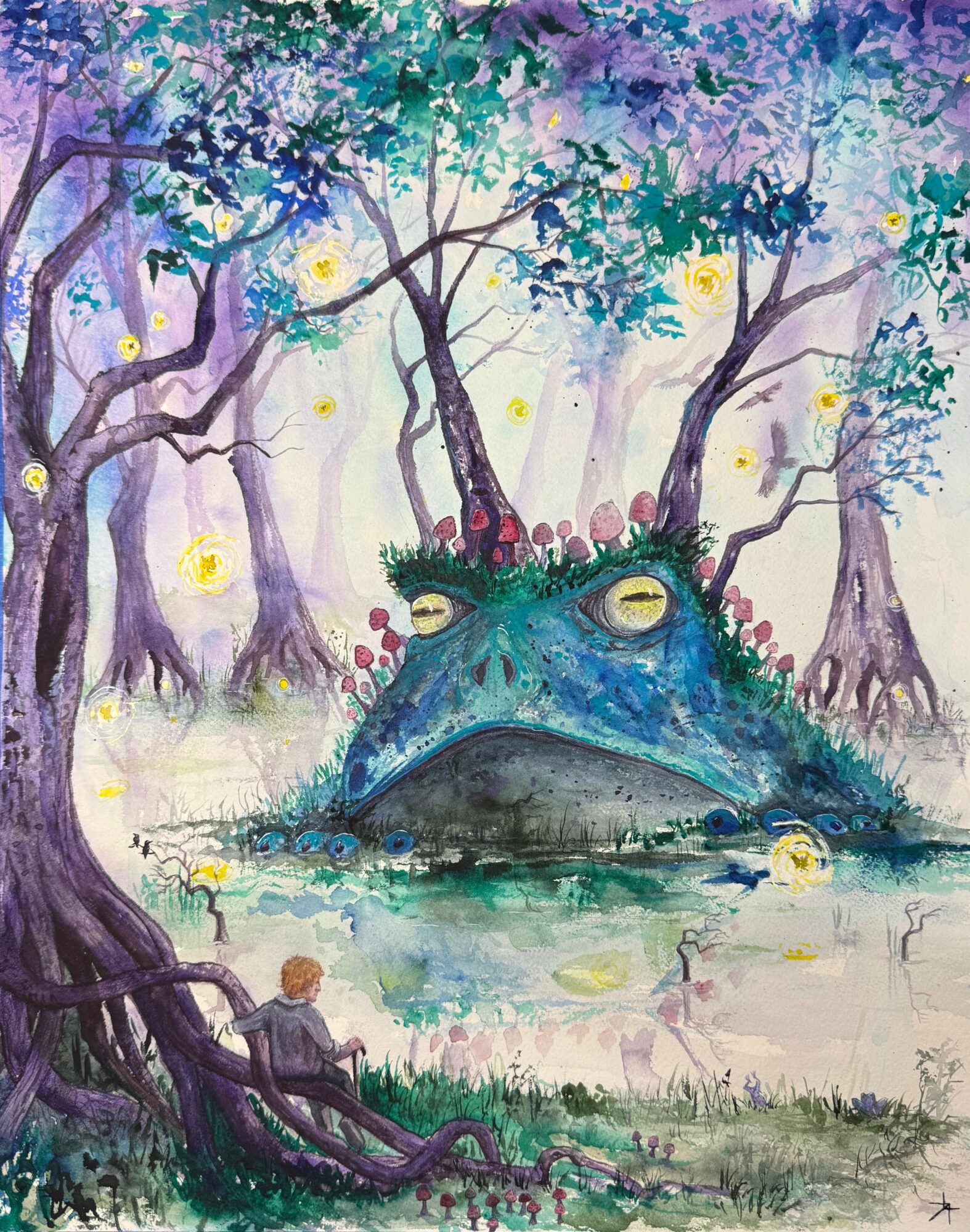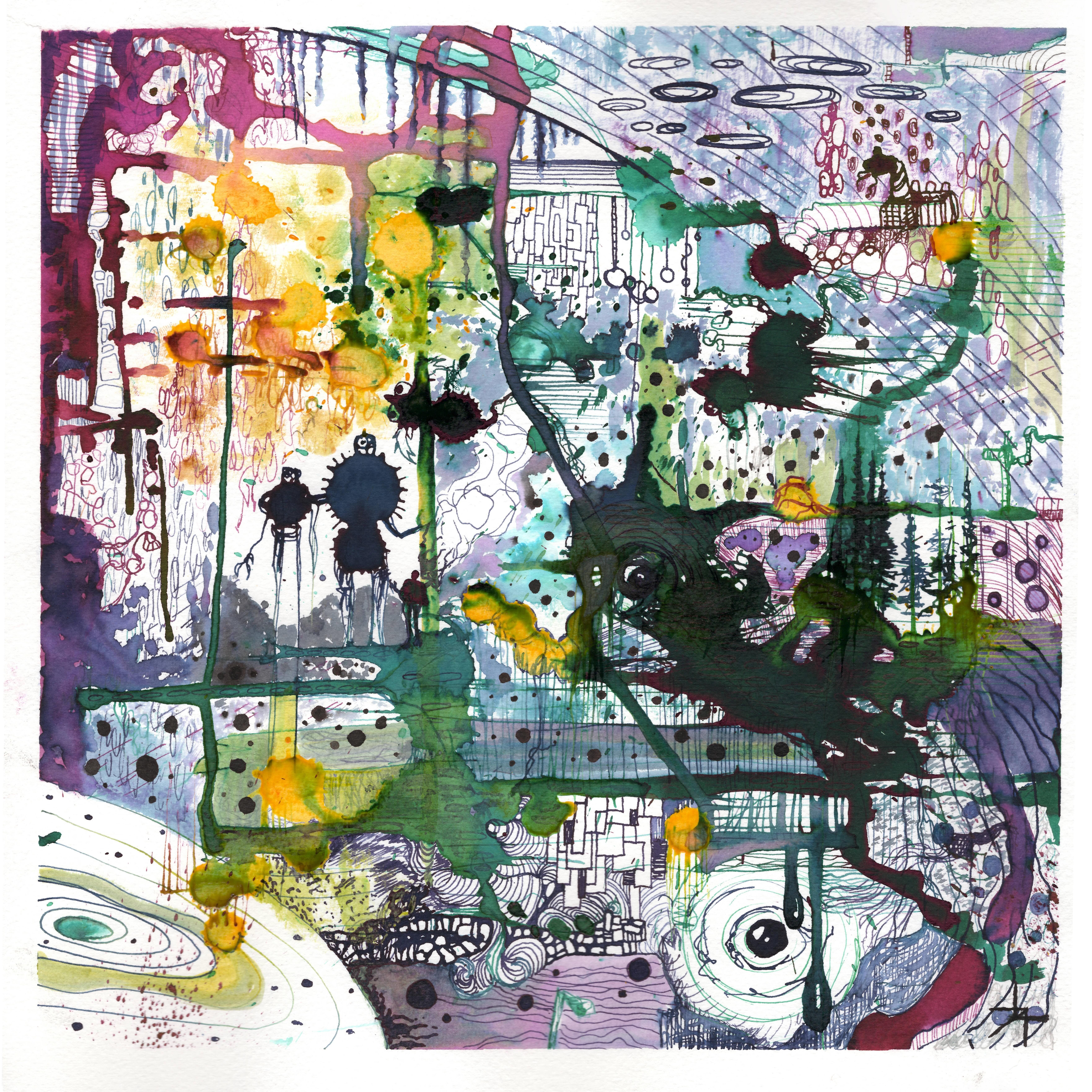 I’m known for creating both whimsical illustrative imaginary worlds and playful stream of consciousness abstract work. Im primarily a watercolor artist but some of my abstract work also uses fluid inks applied in various ways. I use bright, often unexpected colors, and often hide little details and story elements that make you get up close to find them. I consider myself something of a visual storyteller, but one that ultimately wants the viewer to determine the narrative. Often when people look at my work they are surprised to learn that it’s watercolor. one of the advantages of being largely self taught, is I learned traditional rules and techniques after I learned from experimenting, so I didn’t have anyone saying “not that way” or “that’s not how you use that”. As a consequence, my work doesn’t look like what most people are used to when they hear watercolor.