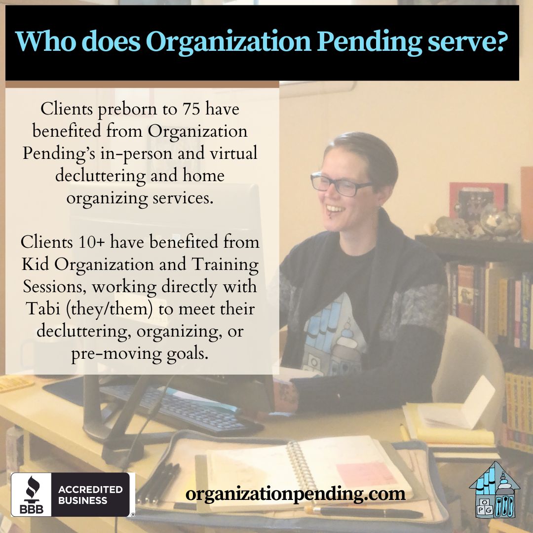 I’m Tabi Berkey (they/them), Owner/Operator of Organization Pending, offering in-person and virtual home organizing services from Columbus, Ohio. Along with sustainable home organizing services that includes an online list of Community Recommendations for recycling, donating, and disposing of items properly, Organization Pending focuses on creating functional systems for clients and their families through Training Sessions and Kid Organization Sessions. Through these sessions, clients and their families work directly with me, learning the steps of decluttering and organizing with tips specific to their family’s needs and lifestyle. Clients can really benefit from working with a home organizer, hearing how I think about the space, learning the questions I ask when we’re considering our organization options, and having an impartial third party to help them move through decluttering decisions. At times, knowing the specific cause your items are going to support can turn the “maybe” that hasn’t been used in 5 years, into a “donate”.