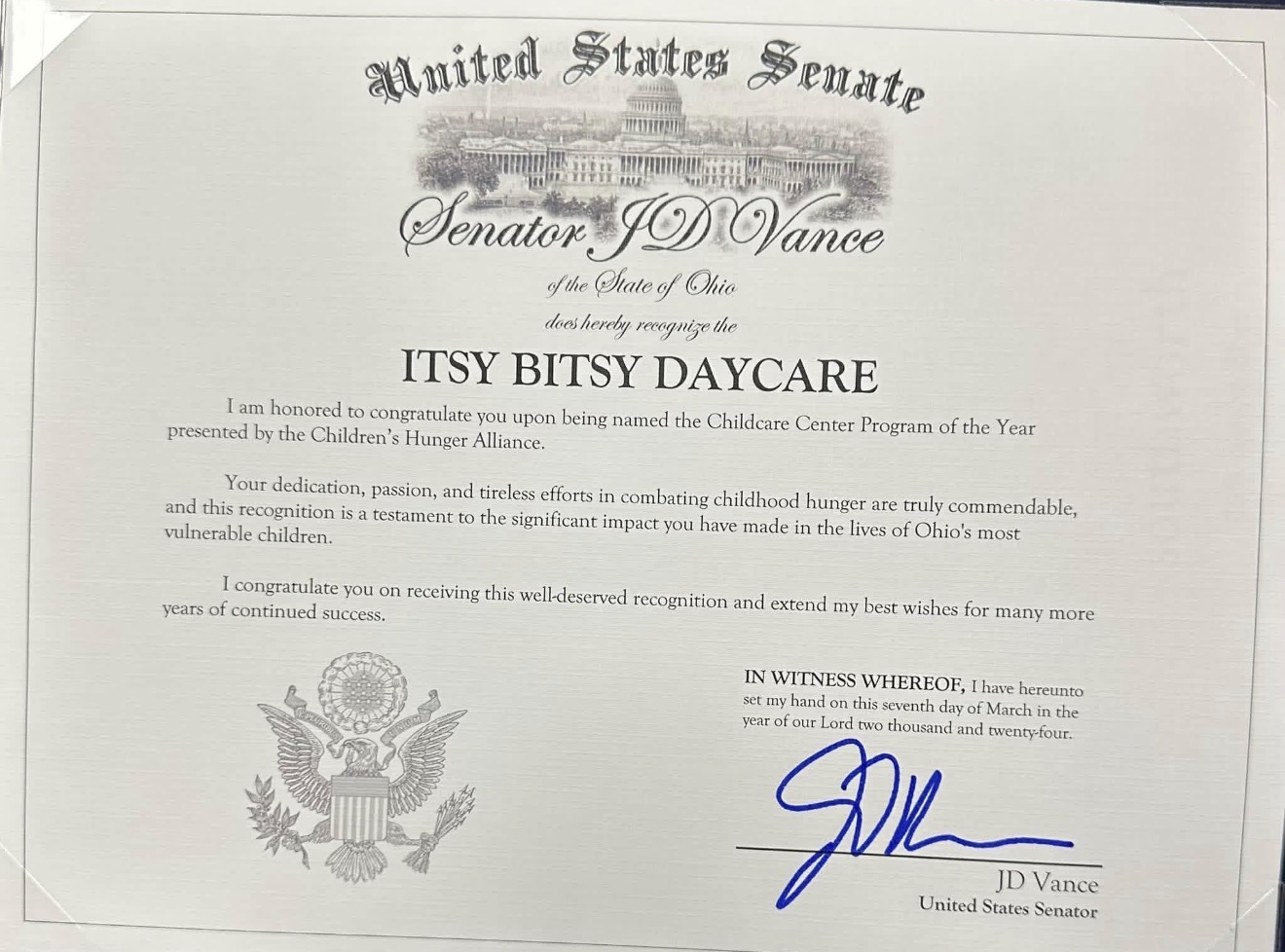 We are a faith-based daycare providing care to kids 6 weeks to age 12 years old. We teach from two curriculums; creative given by state and Abeka to supplement for faith based. We are always over staffed as I believe in many hands make light work. All my staff bring a unique and loving touch to our environment that enriched all the lives of the kids entrusted to our care. We’ve also been given the Silver rating in childcare from DCY. We were nominated and won the Children’s Hunger Alliance 2023 Daycare Center of the Year. We’ve also been recognized by our Ohio House of Representatives and Ohio Senate.