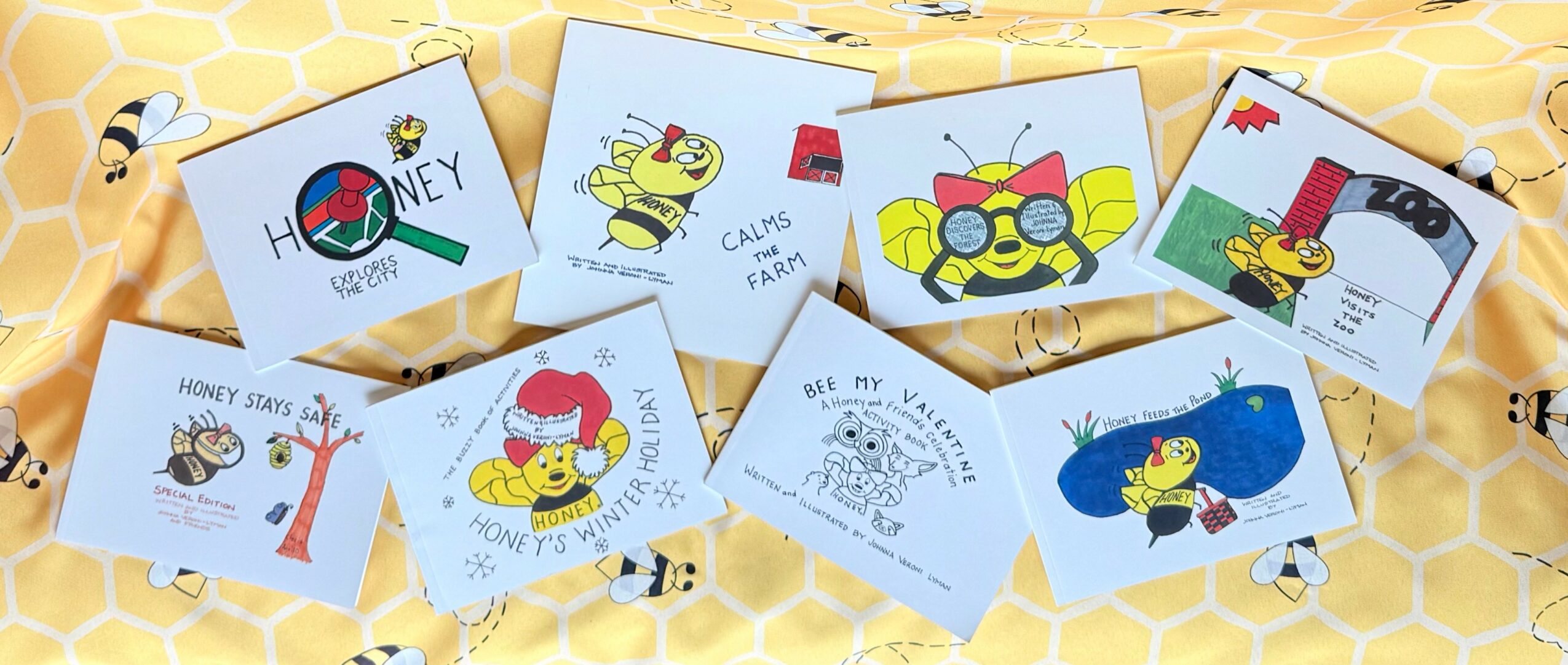 During the time that I was working on the first series of books, COVID hit. Because I was a special needs preschool teacher, I wanted to help find a way to give the kids ideas of some things that they could do during lockdown. With the help of some young friends and relatives, HONEY STAYS SAFE was written, illustrated, and published. Each of the eight kids who participated, illustrated a page for the book. It turned out great and they are all now published authors and illustrators.