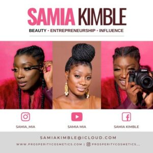 My name is Samia Barnes. I’m 29, and I’m from Cincinnati, OH; both of my parents are entrepreneurs, so it’s no surprise that I became my own boss as well! I’m a wig maker and influencer/ content creator, and I graduated from the University of Toledo with a bachelor’s in communications and media. I have always had a passion for people and beauty for as long as I can remember. My mother was a hairstylist, so I’ve been around beauty my entire life. What began as beautifying fellow students in college has flourished into my full-service cosmetics brand, Prosperity Cosmetics. Prosperity Cosmetics is dedicated to uplifting, encouraging, and inspiring all people, helping others see their true beauty inside and out, as well as encouraging others to continue to prosper and look good while doing so. I also have a new podcast called “The Prosperity Podcast.”