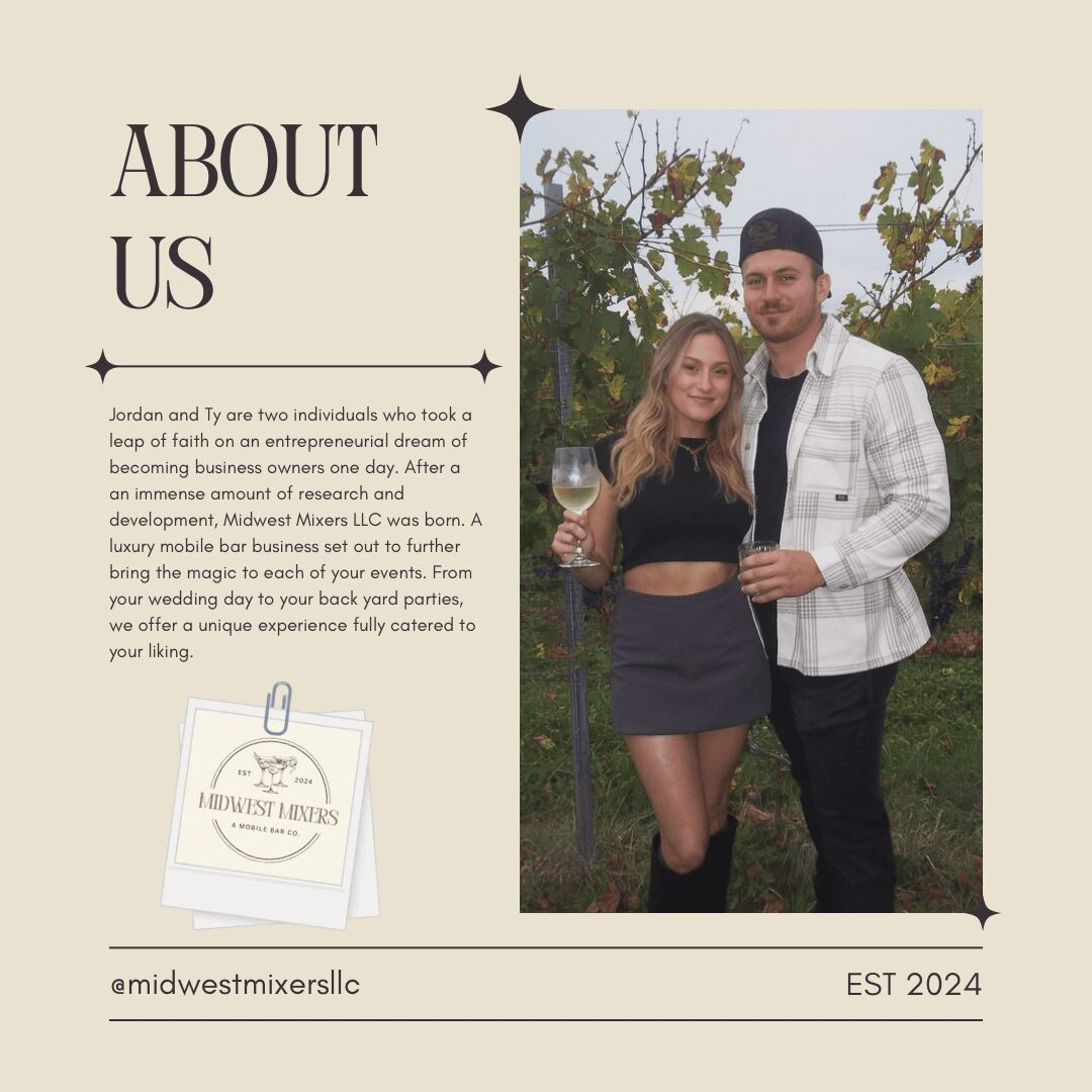 Ty and I began brainstorming business ideas in August of 2024, as two entrepreneurial minded individuals – we wanted something that we could start on the side and eventually grow to a larger scale to ditch our traditional 9-5s. We wanted something unique but with a very strong target market. Eventually the idea of a mobile bar business came to us after having come across one over social media. It was the perfect idea to run with and saw the endless opportunities, not only weddings but all kinds of events. With my background in marketing/business and Ty’s self-taught background in graphic design and carpentry we knew it was something we could make a reality. All it took was a bit of research into the legalities and what the upfront costs would be, and decided to fully go through with it and acquire our LLC in October of 2024. Since then we have bought our first trailer and are looking to have renovations done by this summer. We’re incredibly excited to see how this takes shape and where this venture will take us!