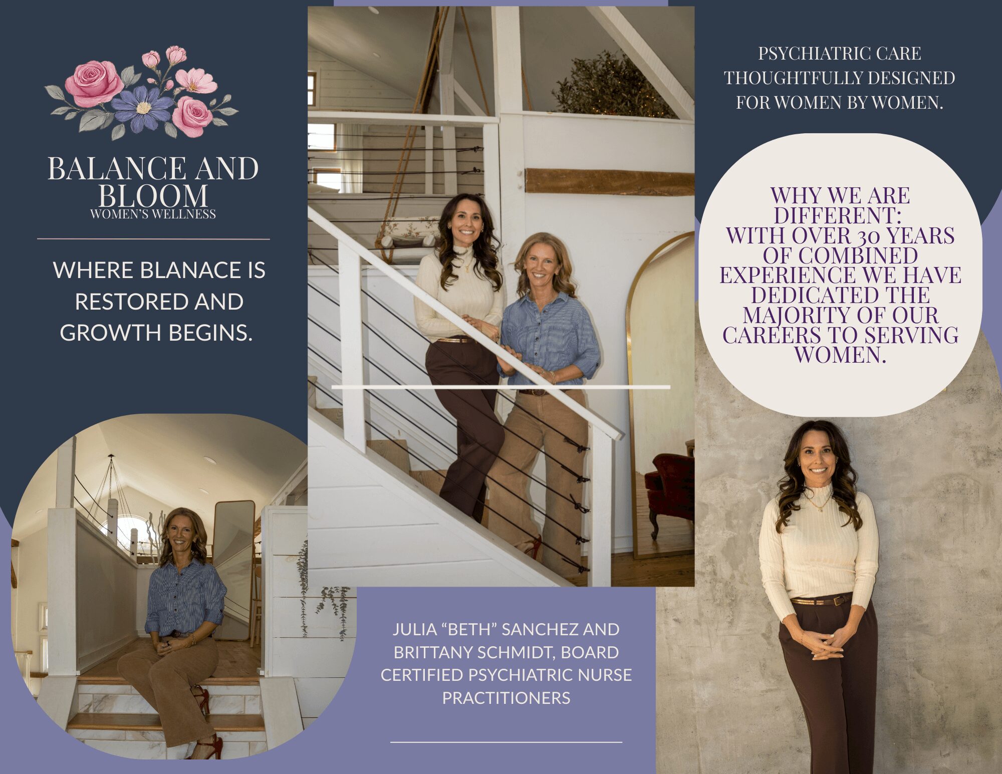 Balance & Bloom Women’s Wellness was created out of a shared passion for improving access to thoughtful, specialized mental health care for women. Both of us have backgrounds in women’s health, as labor and delivery nurses, prior to becoming psychiatric nurse practitioners, and through those experiences, we saw firsthand how often women’s emotional and mental health needs—especially during pregnancy, postpartum, and times of hormonal transition—were overlooked or not fully addressed.