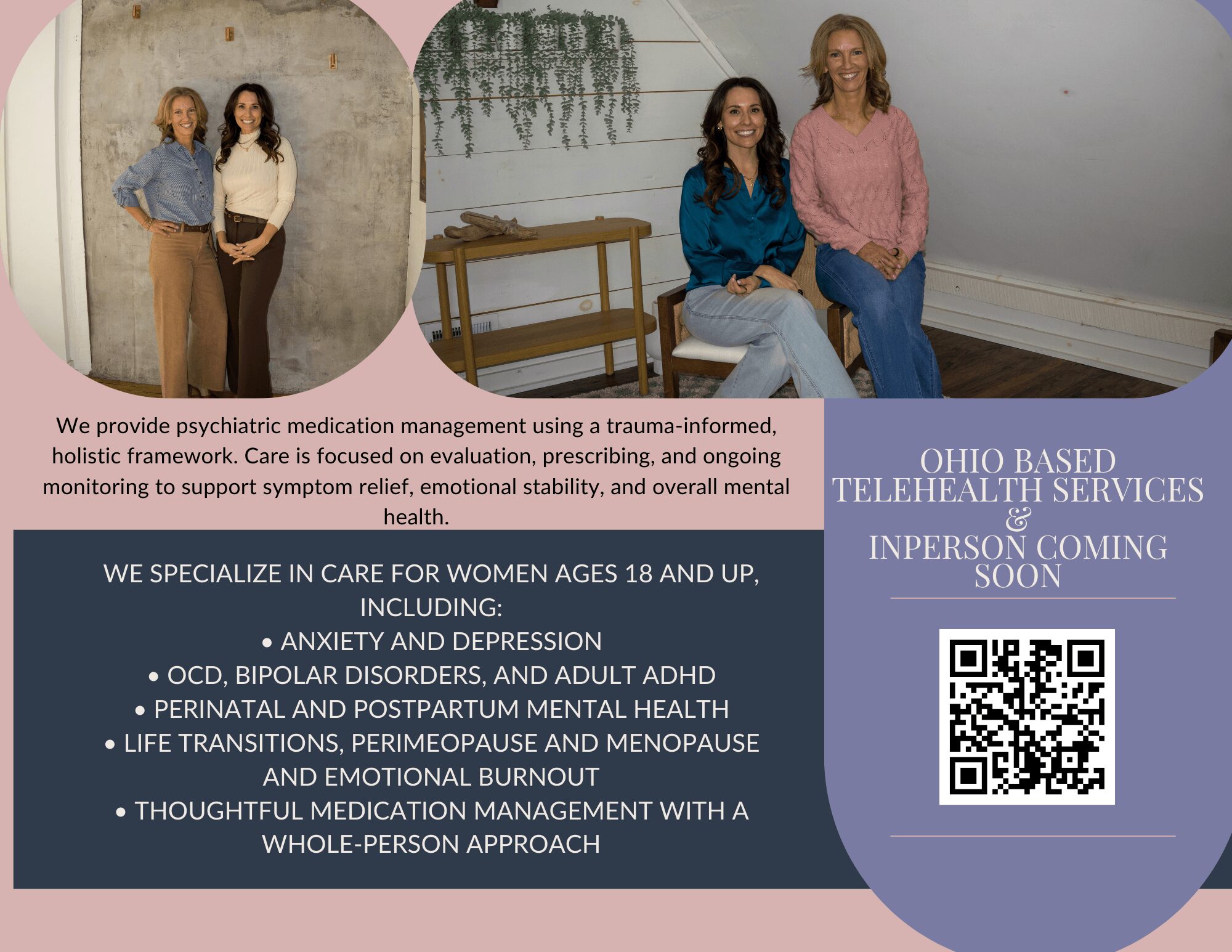 As we transitioned into psychiatry, it became even more clear that there was a gap in care. Many women were struggling with anxiety, depression, mood changes, and identity shifts during major life transitions, yet weren’t receiving care that felt comprehensive, personalized, or aligned with what they were experiencing.