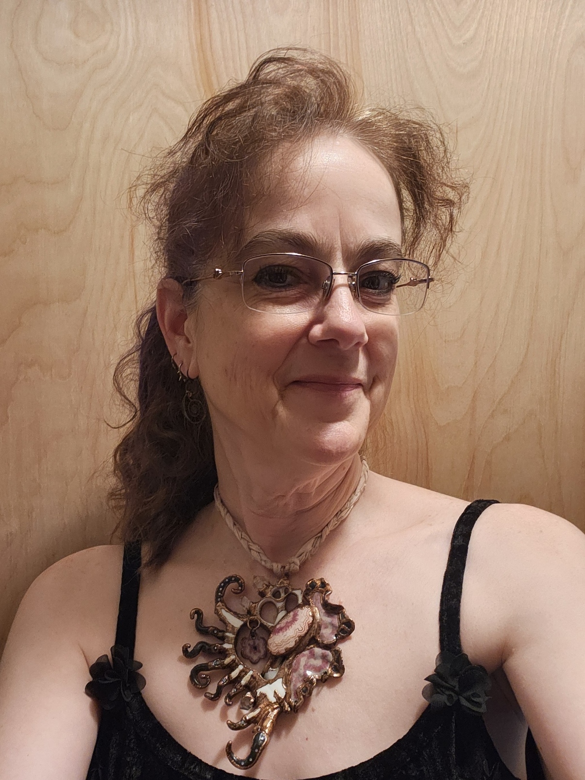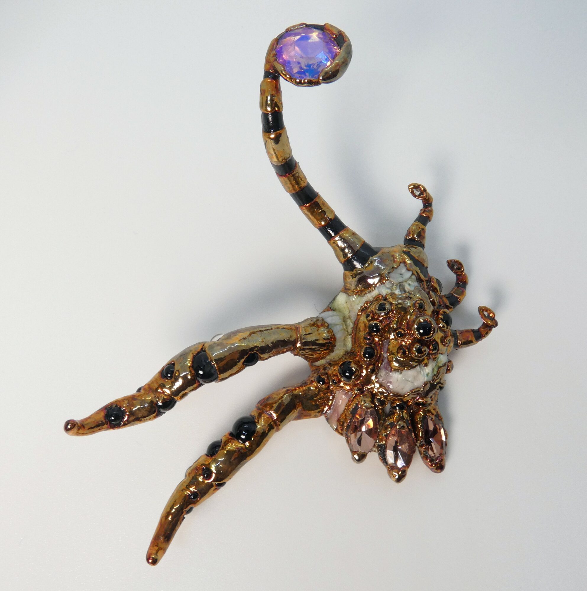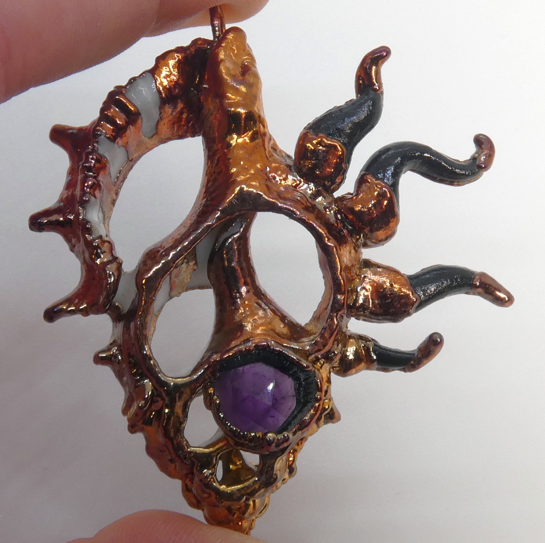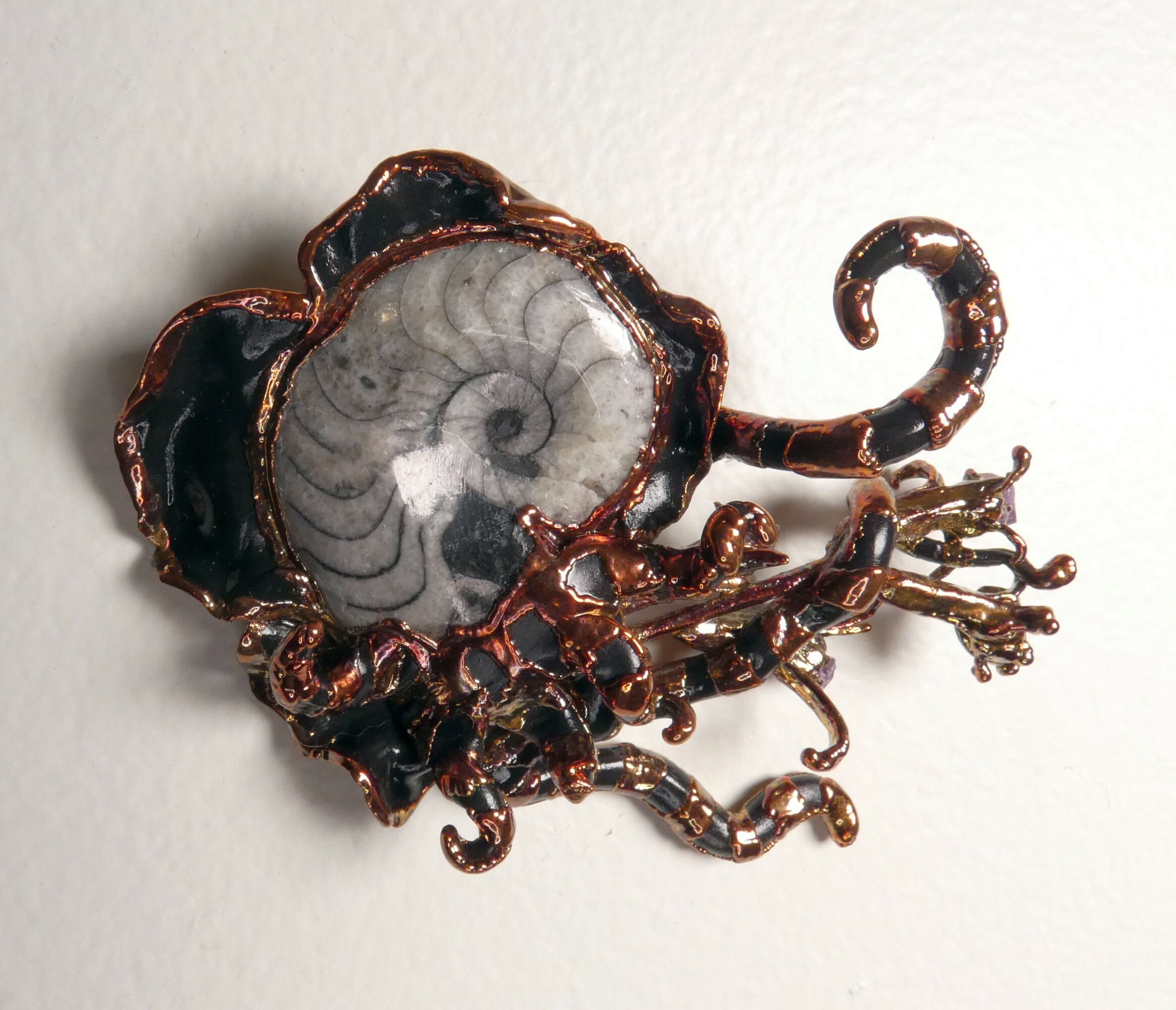 I’m known for making organic-looking multimedia jewelry and wall sculptures based upon natural structures. They all crawl with an unknown but benevolent Creature that helps bring beauty from the murky depths. A piece usually begins with a seashell, seed pod or fossil, bedecked with stones, enameled copper, glass, rhinestones or whatever strikes the Creature’s fancy. I use epoxy clay to sculpt the dark lifeform. Its frills and tentacles live in harmony (symbiosis) with these bejeweled natural relics, and are often seen emerging with armfuls of beautiful trinkets from under the waves. I then electroform portions of the piece in copper, which I finish and seal. I conceived of the Creature in 2024, but there have been hints of it throughout my decades of previous jewelry. There are sometimes suffocating waters that attempt to hold us under. The dark Creature is there in the depths, finding those sparks of light, color, beauty, creativity, hope, and love that dwell in the deepest darkness and bringing them with us to the surface.