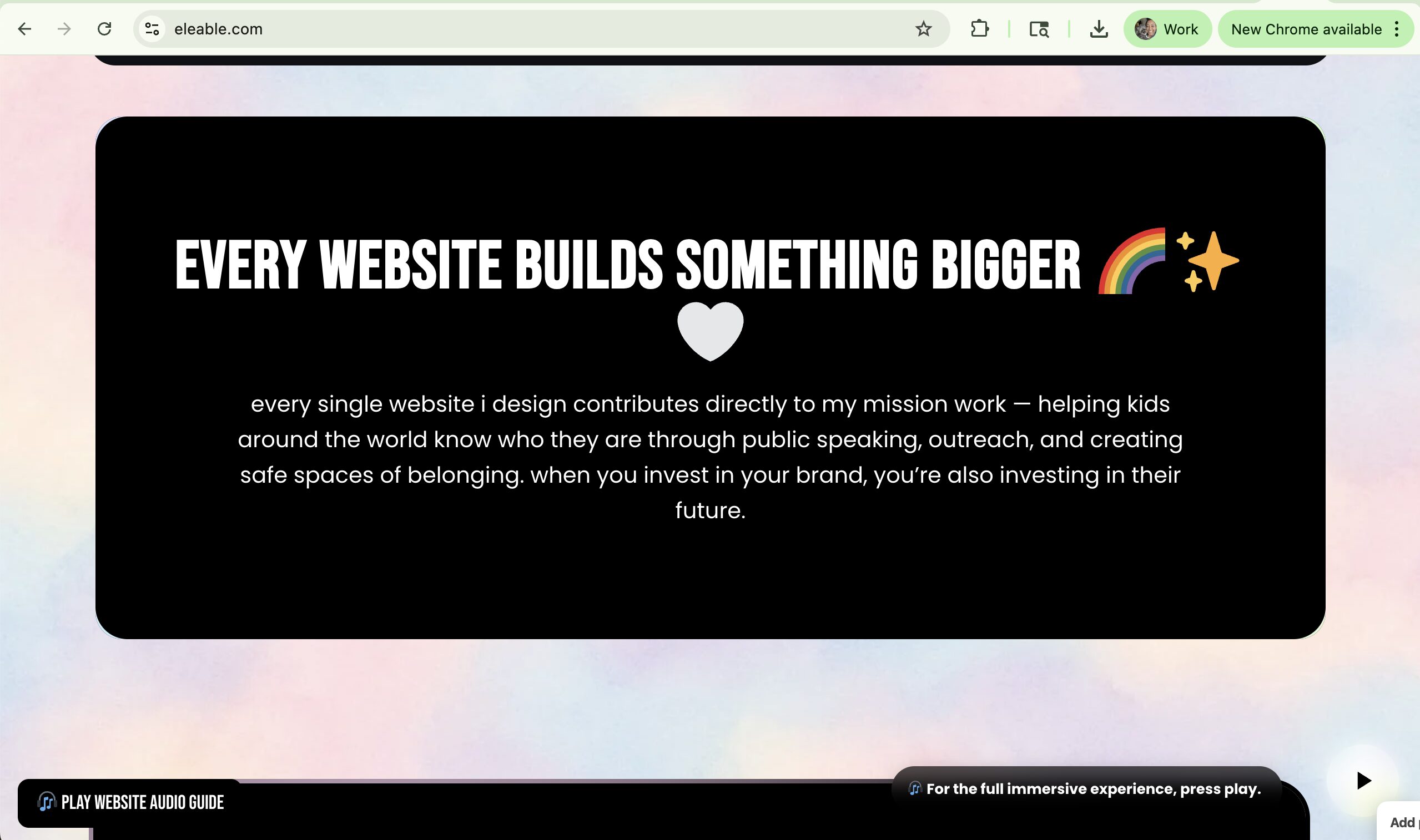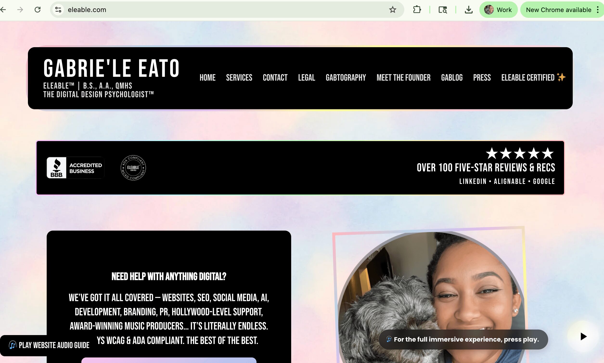 We specialize in Neurodivergent friendly ADA/WCAG-compliant websites, audits, brand psychology, and inclusive storytelling. But what truly sets us apart is the fusion of design, psychology, and accessibility. Every project is Eleable Certified™, meaning it’s not only visually stunning, but also compliant, legally protective, and inclusive. It comes with a seal.