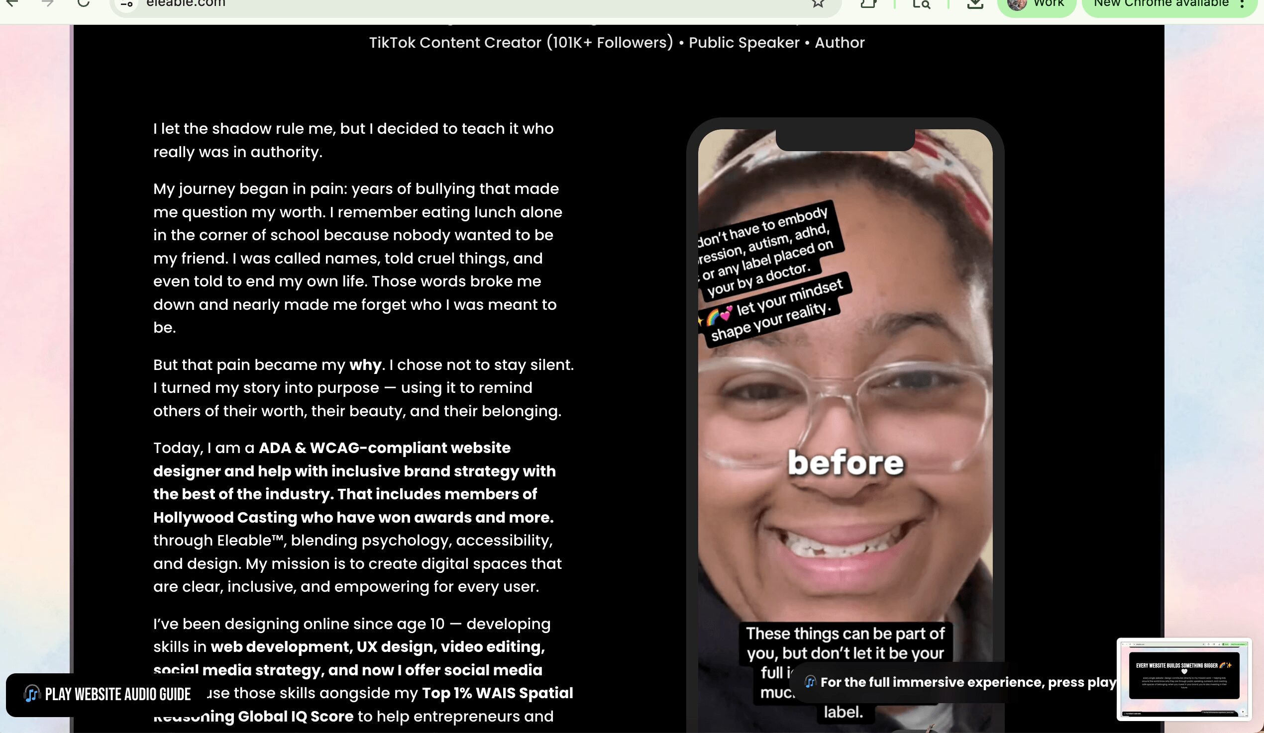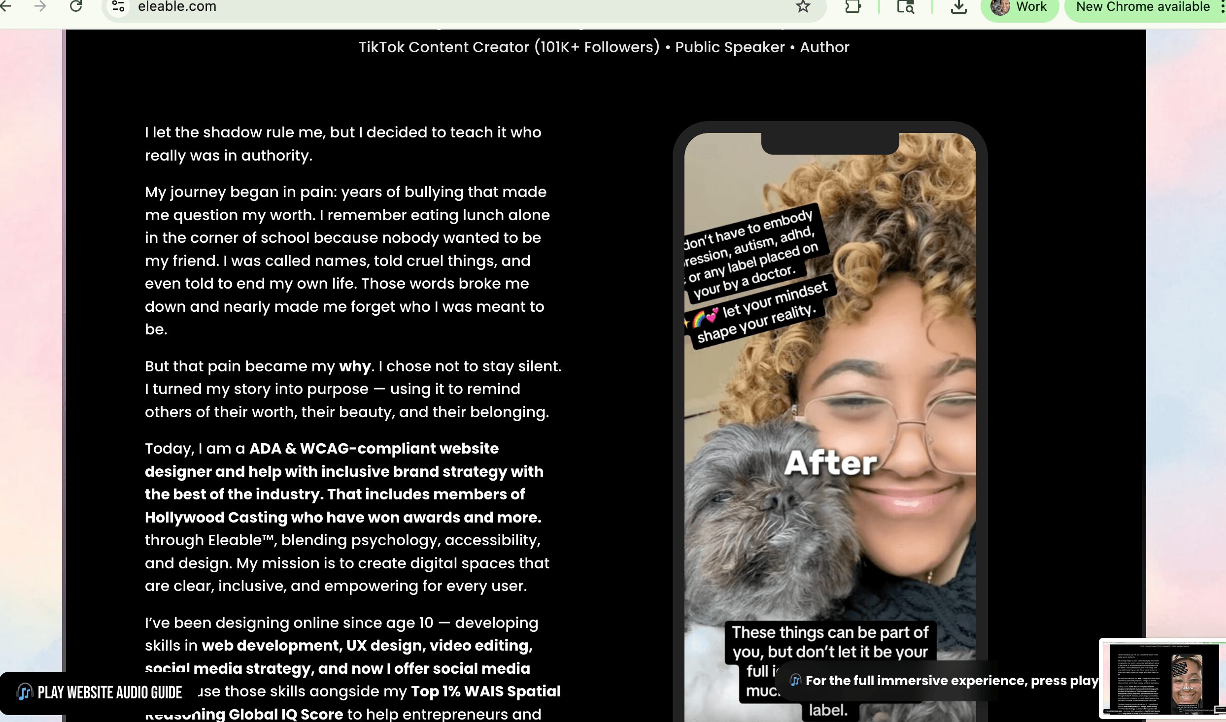 But instead of letting it break me, I transformed that pain into my purpose. I type 22o WPM and have been coding since I was 10 years old, and later combined that with my training in psychology and psychometrics. Out of that fusion came Eleable™, my global digital design psychology agency that now works with many celebrities, global leaders, and more. Eleable builds ADA/WCAG-forward websites and brand systems that are inclusive, legally protective, and human-first. But it’s more than business — it’s my mission.
