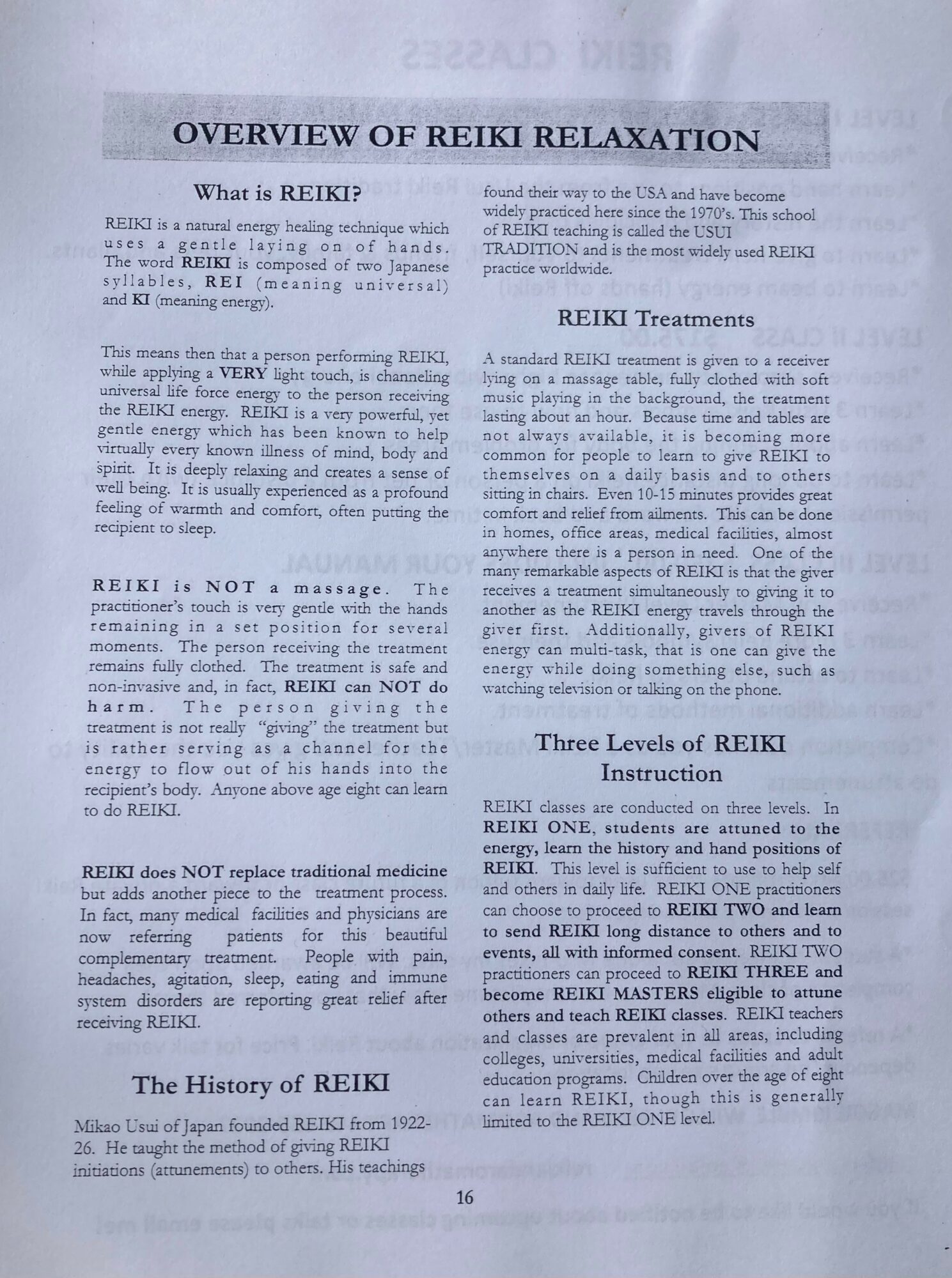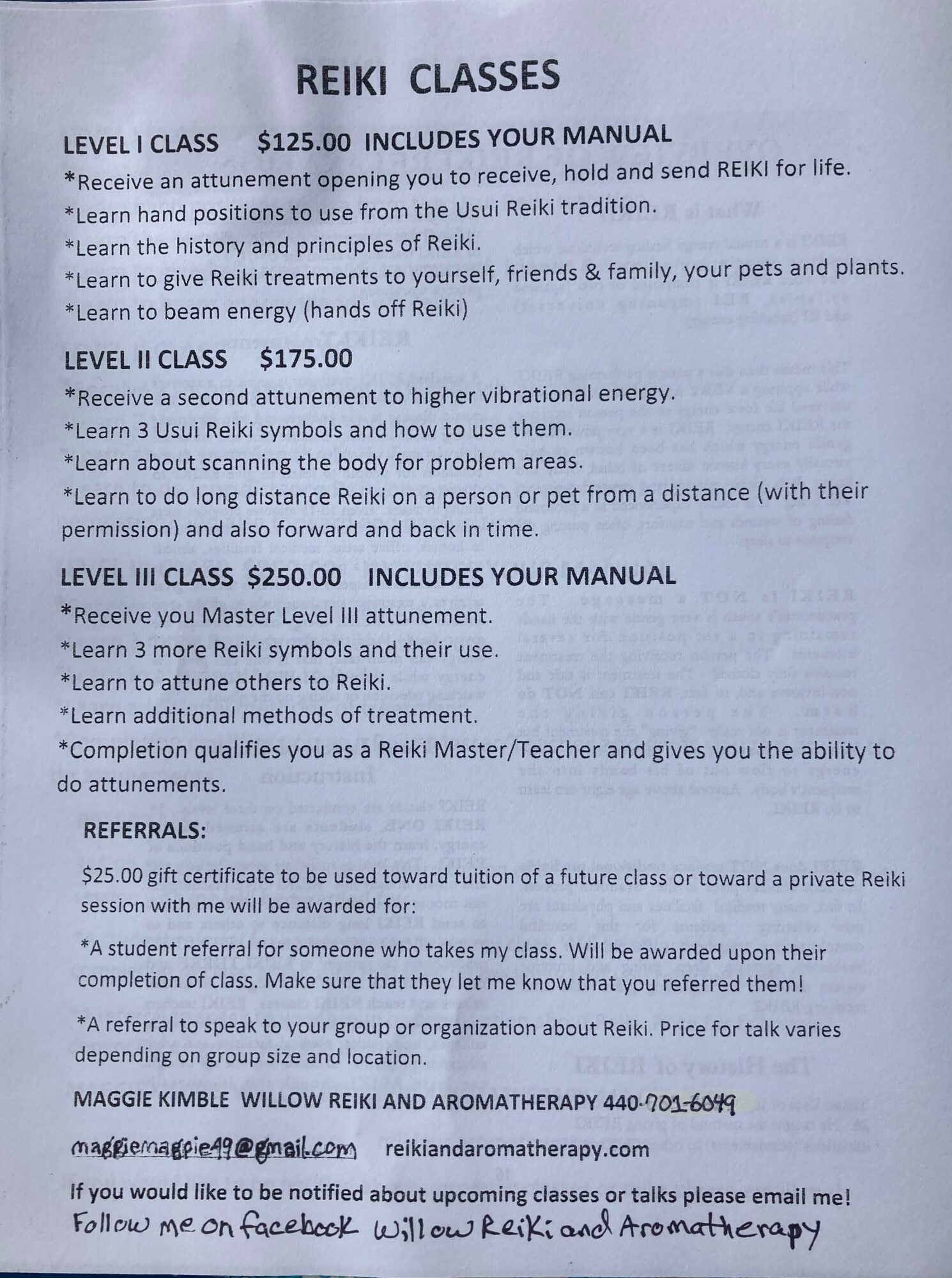 - Reiki classes level I $125, level II $175, level III 250