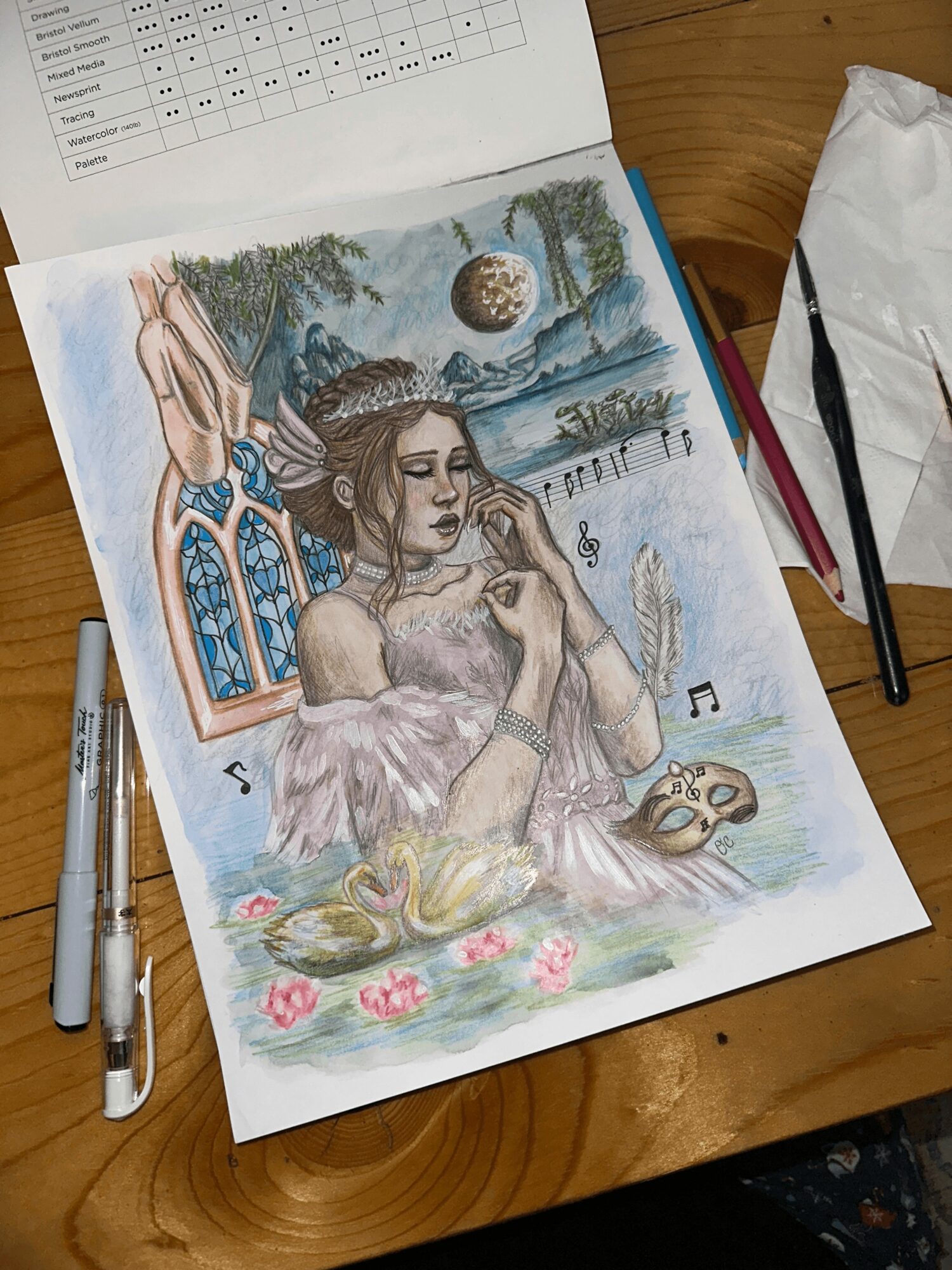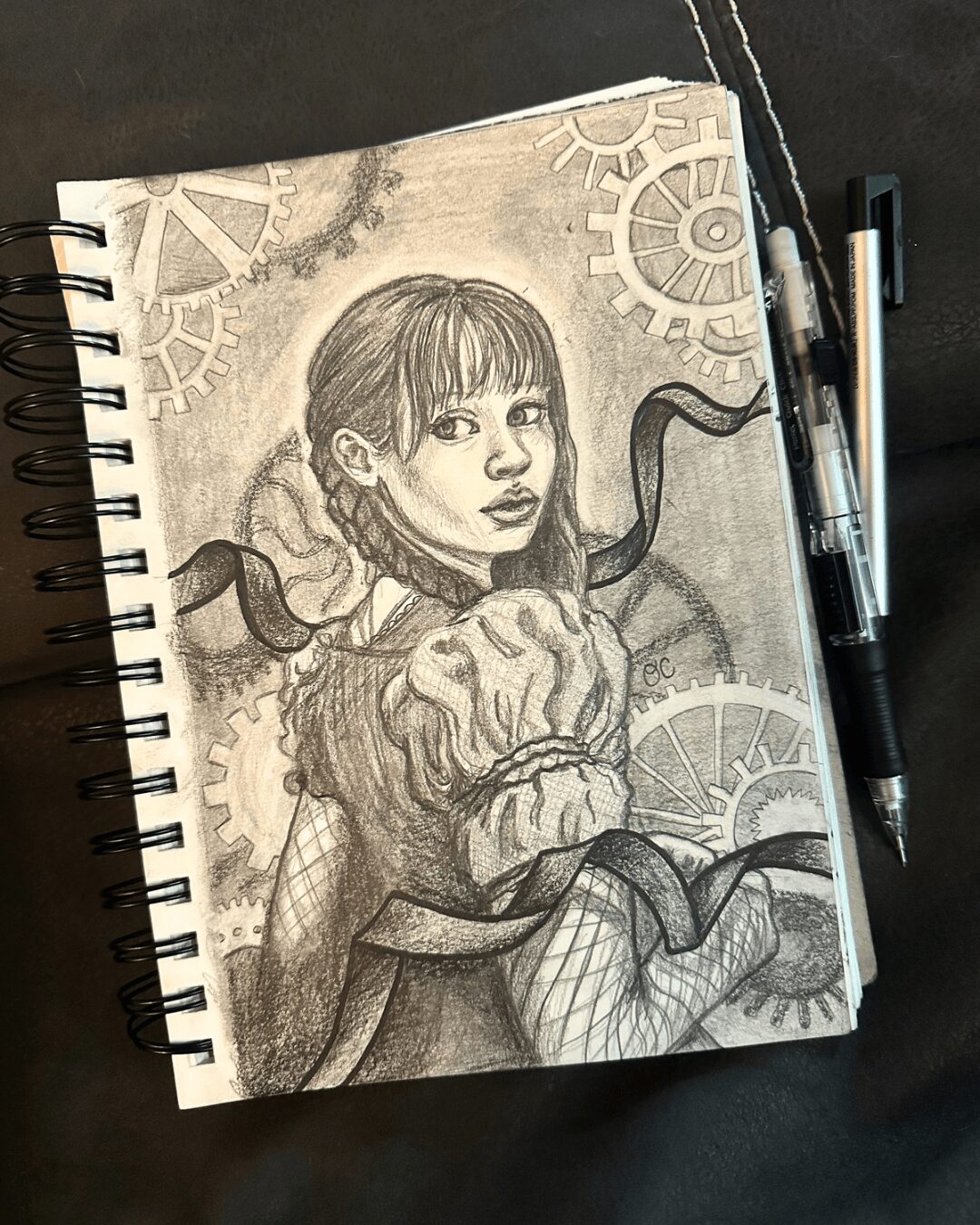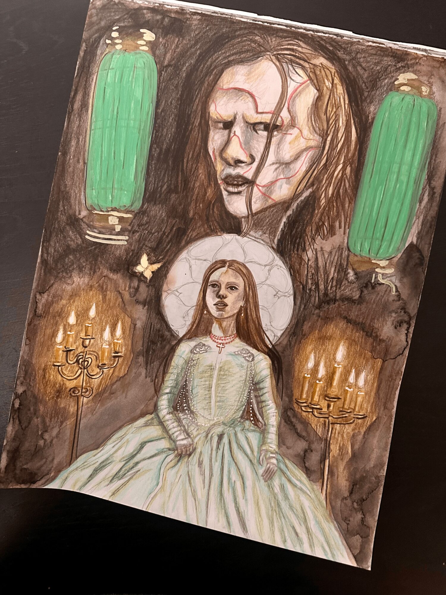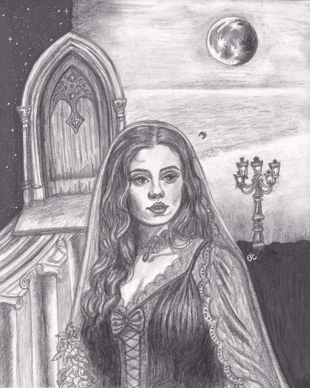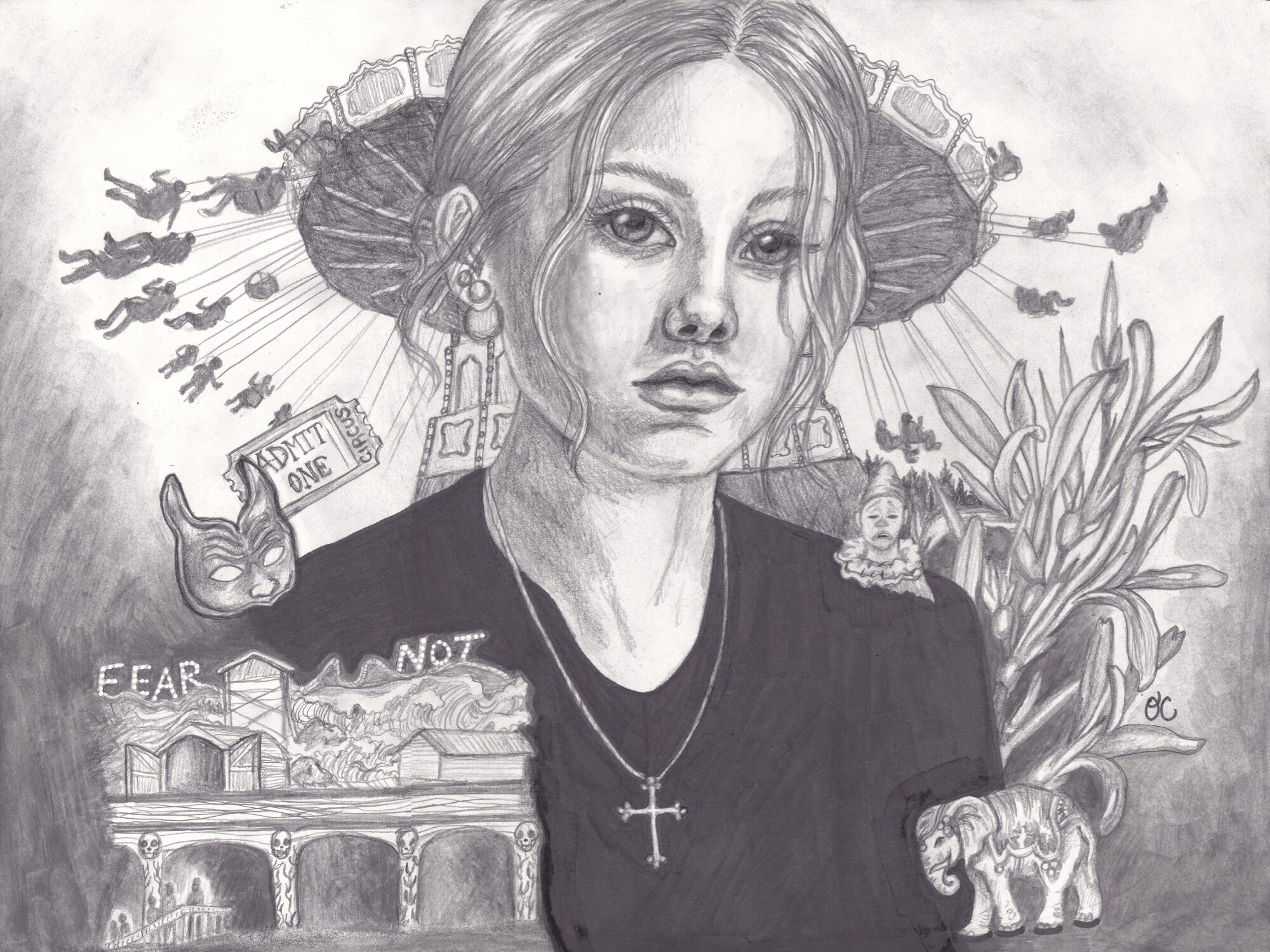I am an artist working in traditional mediums from pencil, to oil paint, to mixed media, to back to pencil again! I love to render portraits, especially surrounded by other elements that tell a story about the character, like a movie poster or fan art. A recent development in my art has been leaning into collage-like compositions that create a sort of montage for the subject. I’m deeply inspired by fantasy, gothic, and religious themes.