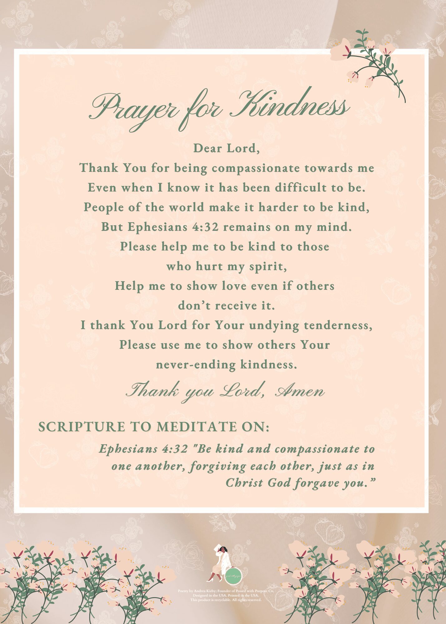 My name is Andrea Kirby, and I am the Founder of Poised with Purpose Co. I aspire to encourage and uplift people around the world with my writing, faith, and creativity. I adore all things vintage, pastel, and alluringly elegant. My faith is the center of my life, and it is implemented throughout the majority of the work I produce.