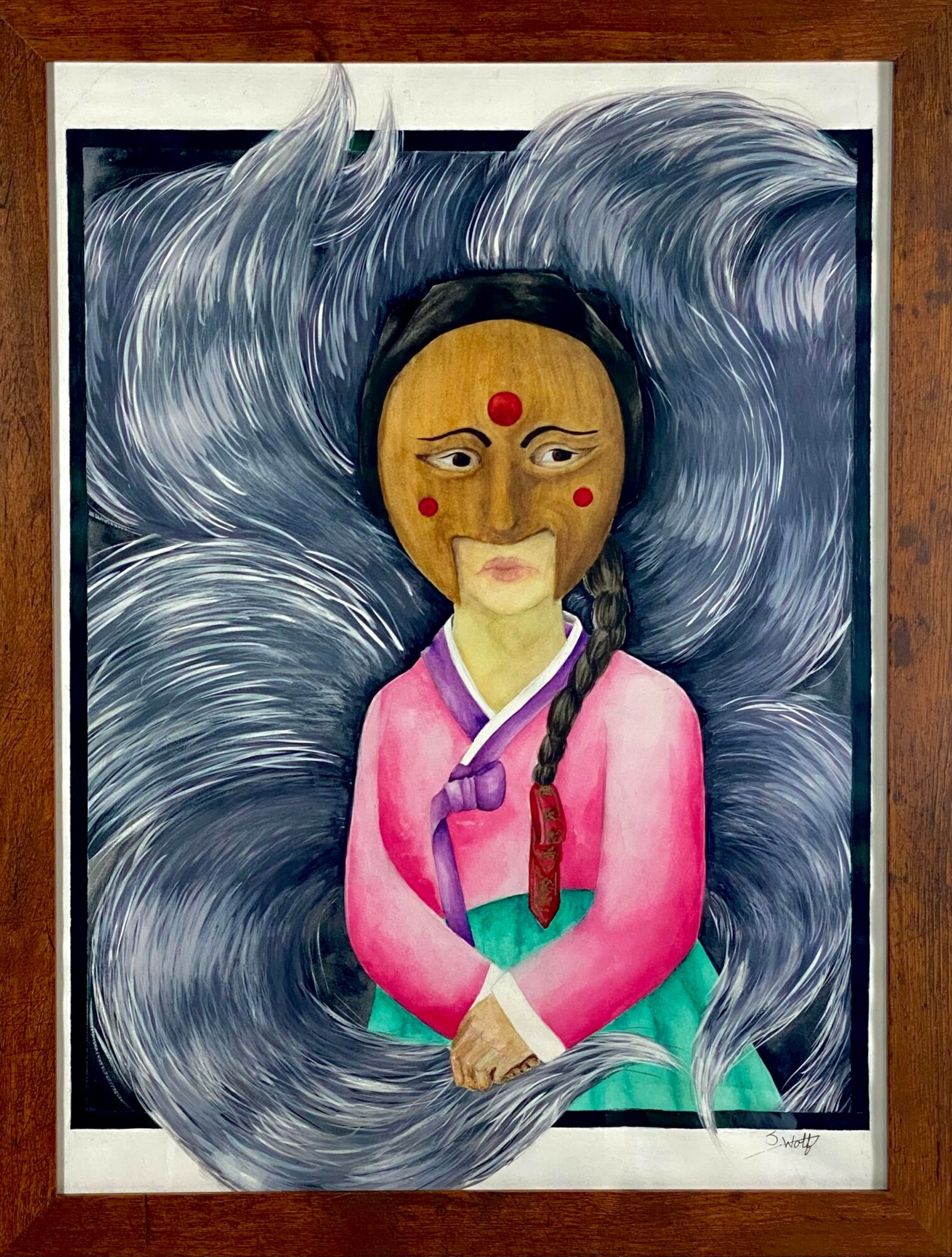 I am in the middle of a long term project that I started in 2020 that is by and for Women Around the World and their cultures. It’s my hope that this series will prompt people to look outside their own cultures and where they live. Each work focuses on the clothing, hair style, makeup, performing arts, religion and mythology of the culture. Each piece is a combination of different mediums from watercolor, ink, gouache, color pencils, acrylic, and markers. I take a few months to research before even doing the first rough sketch. I have finished Japan and Korea, I am currently working on the Northeast Indigenous people of North America. I am aiming to do a minimum of twenty works in this series.